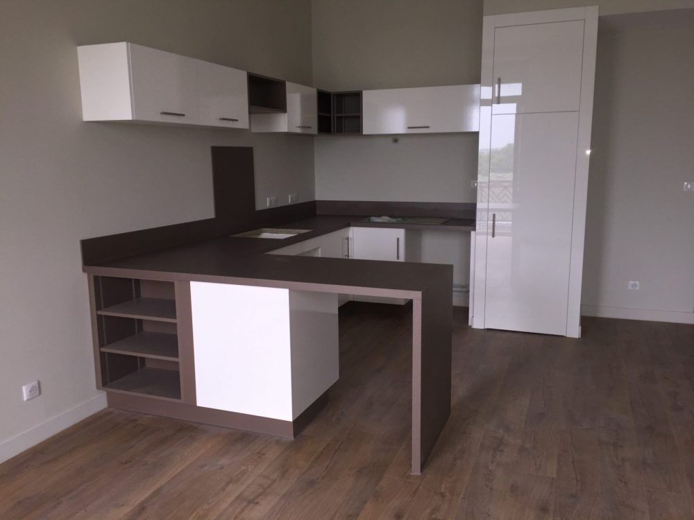 Les façades laquées blanches contrastent avec le stratifié brun du plan de travail et des chants, offrant un ensemble harmonieux et moderne. Le bar intégré crée un espace convivial tout en délimitant la cuisine du séjour.