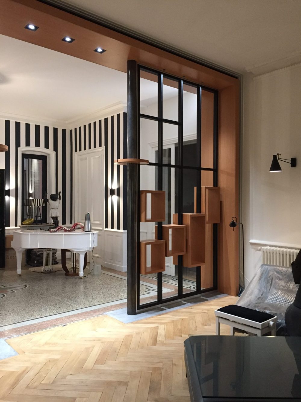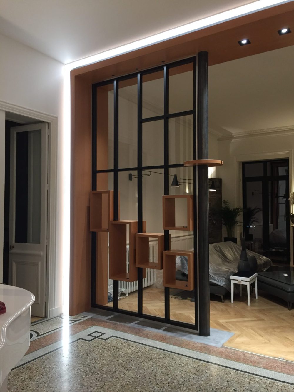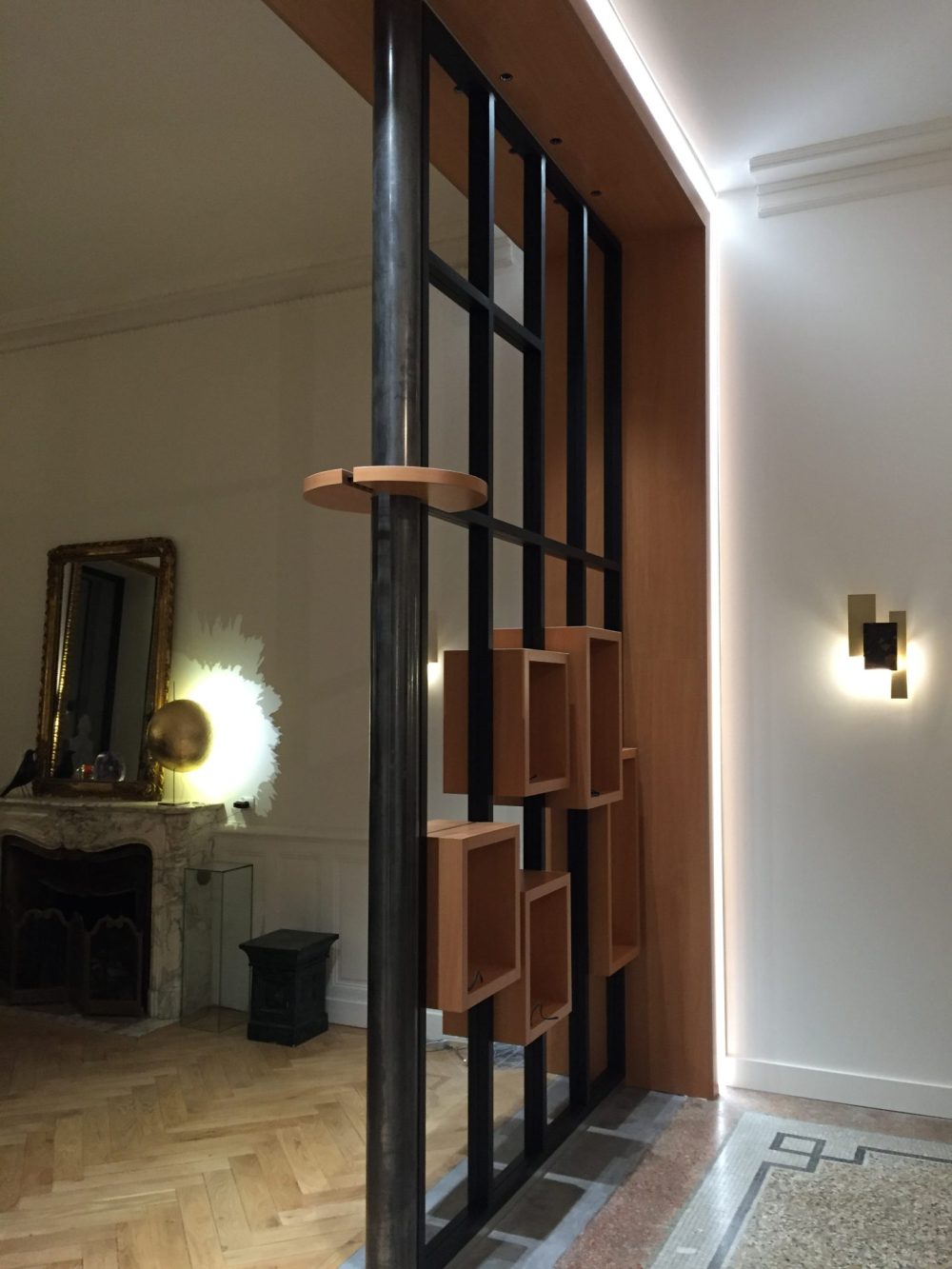 Composée d’une structure métallique noire et d’éléments en bois intégrés, cette création permet de délimiter deux zones de vie tout en laissant passer la lumière naturelle. Les modules cubiques suspendus offrent une dimension décorative et un effet de profondeur qui renforce le caractère design de l’ensemble.