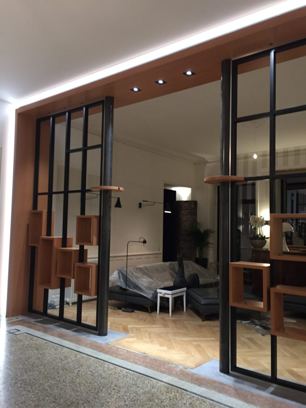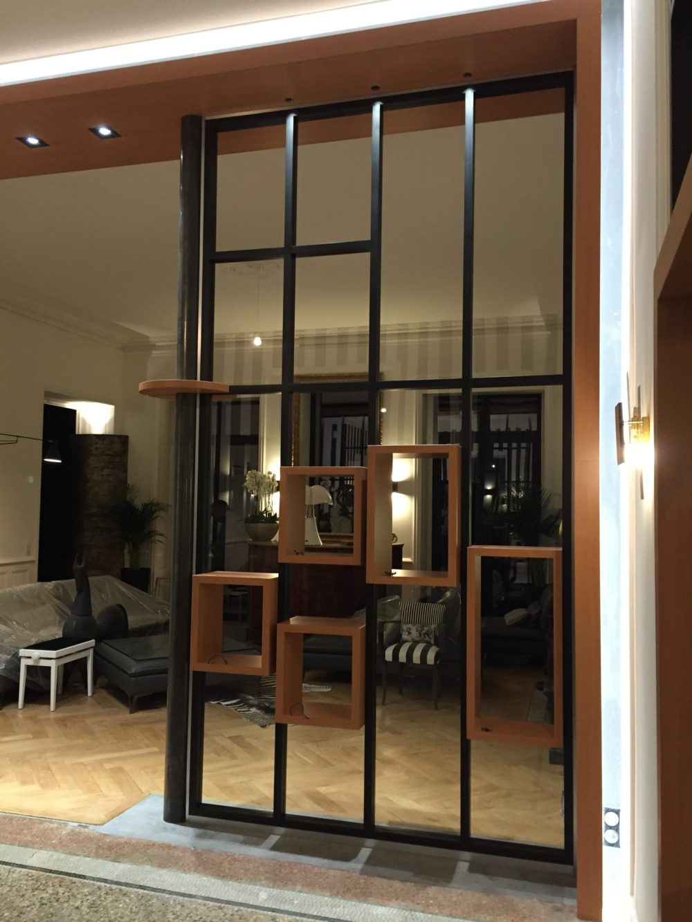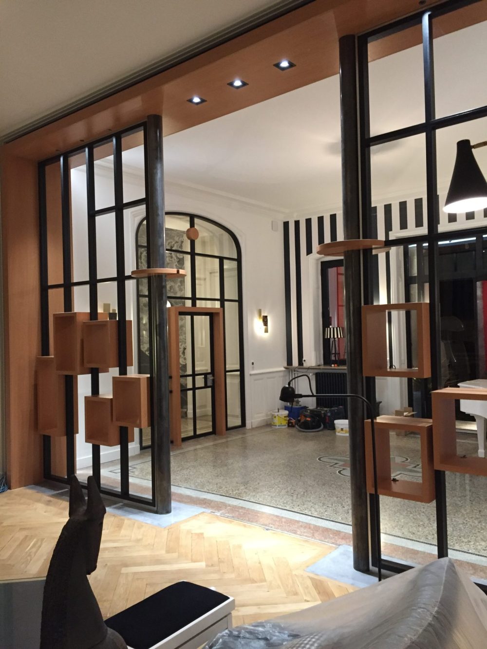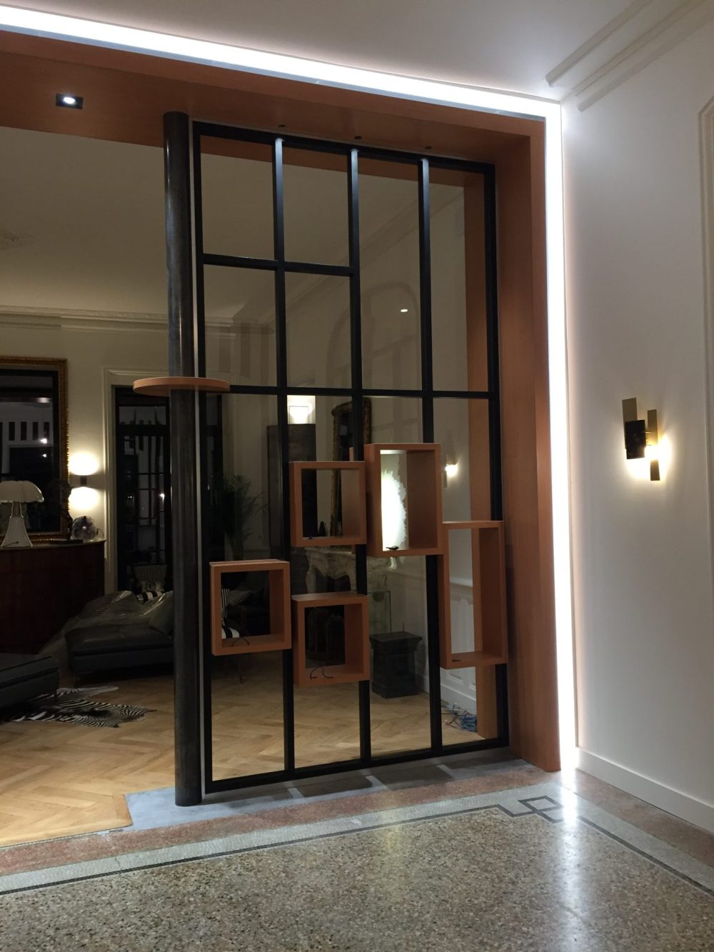 Composée d’une structure métallique noire et d’éléments en bois intégrés, cette création permet de délimiter deux zones de vie tout en laissant passer la lumière naturelle. Les modules cubiques suspendus offrent une dimension décorative et un effet de profondeur qui renforce le caractère design de l’ensemble.